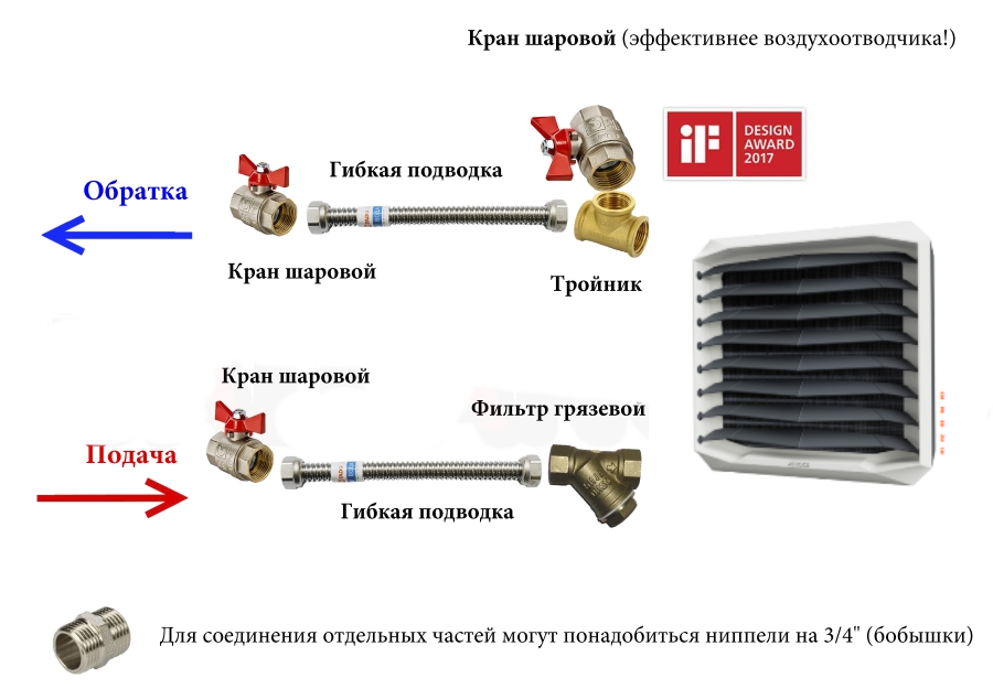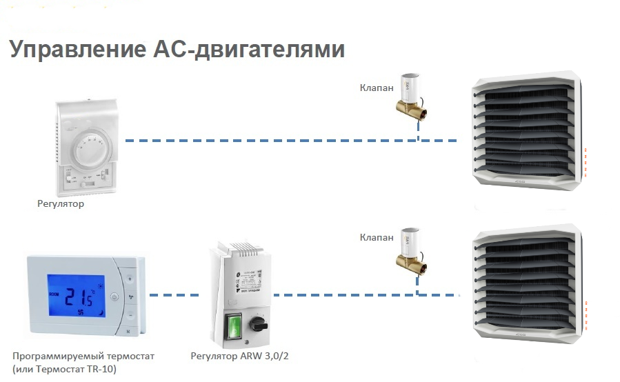 Схема подключения пульта управления водяным тепловентилятором AEROCK AC и ECСхема подключения труб водяных тепловентиляторов AEROCK Пример базовой схемы подключения воздушно-отопительных агрегатов AEROCK AC